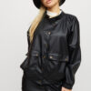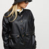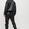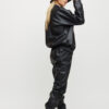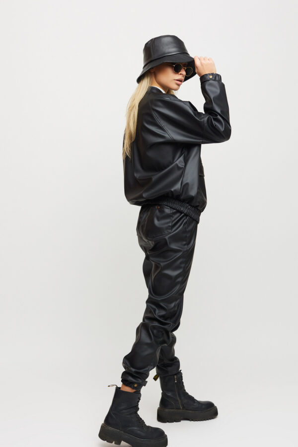 Костюм куртка и штаны из матовой эко-кожи: куртка-косуха свободного кроя со спущенным плечем, на рукавах манжеты, накладные карманы, застежка: кнопки и змейка; брюки-джоггеры с манжетами, есть карманы