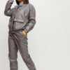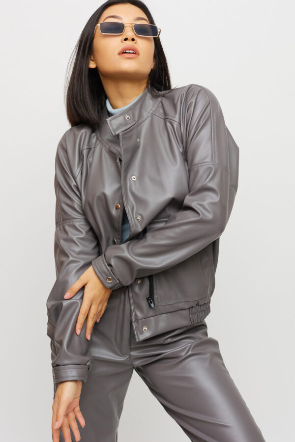 Костюм куртка и штаны из матовой эко-кожи: куртка-косуха свободного кроя со спущенным плечем, на рукавах манжеты, накладные карманы, застежка: кнопки и змейка; брюки-джоггеры с манжетами, есть карманы