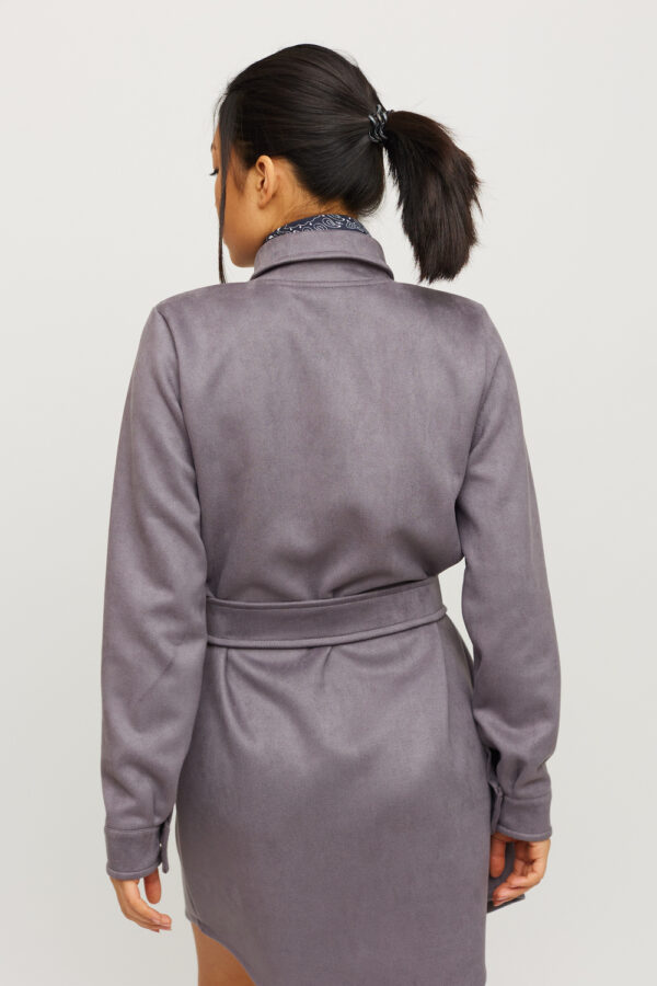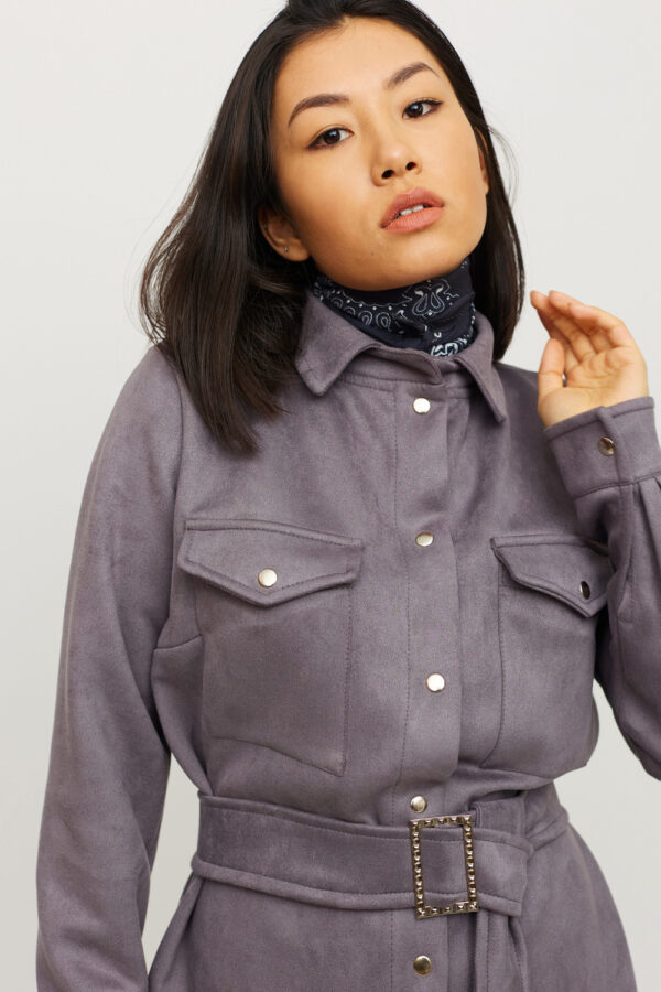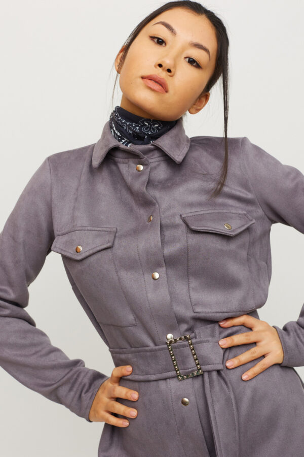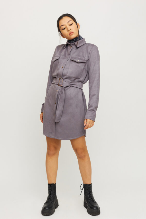 Платье-рубашка мини длины прямого кроя из замша, длинный рукав, воротник-стойка, большие накладные карманы на груди; асимметричный низ; застежка: кнопки, пояс