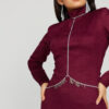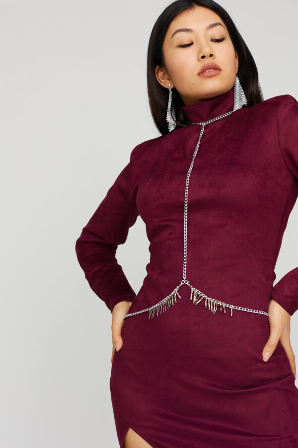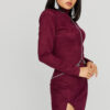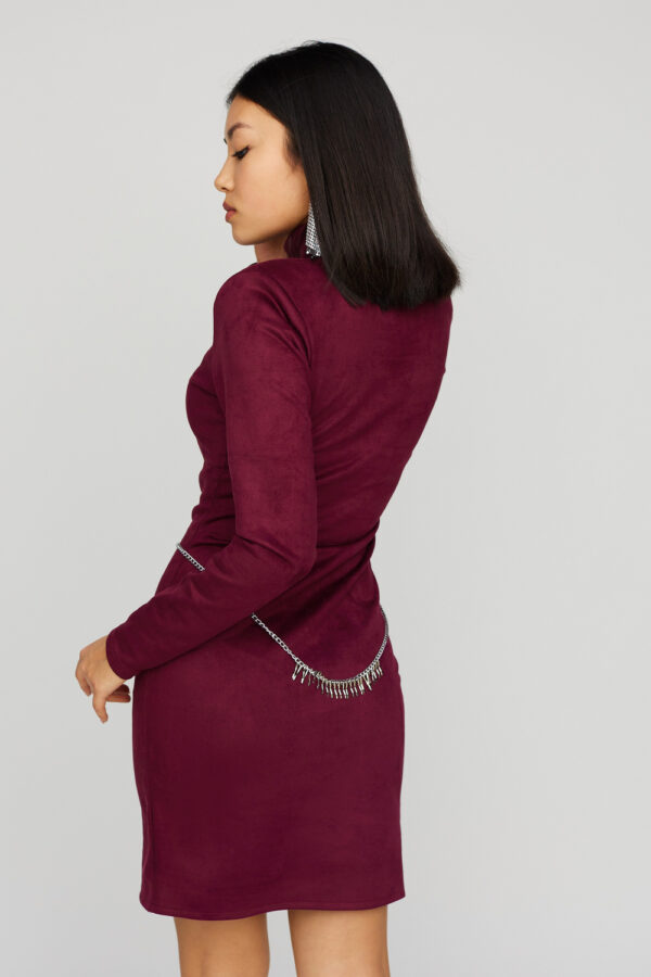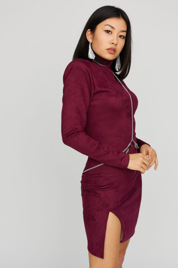 Платье-футляр мини длины из замша, воротник-стойка, рукав длинный с подплечиком, спереди невысокий разрез.