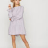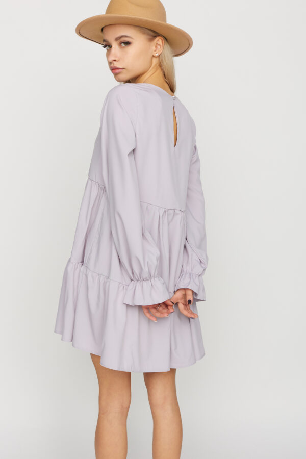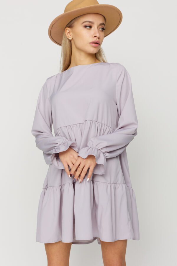 Платье мини из легкой ткани, отрезная линия талии, круглый вырез, спущенная линия плеча, рукав длинный с рюшей, фиксируется на запястьях с помощью резинок, по низу юбки рюша.
