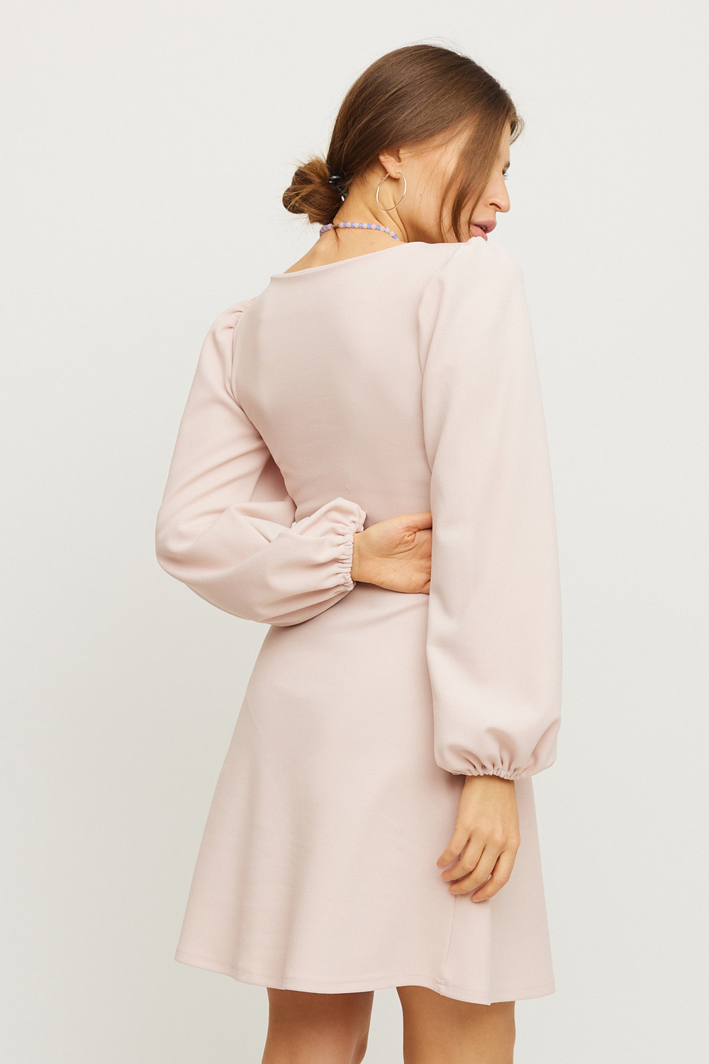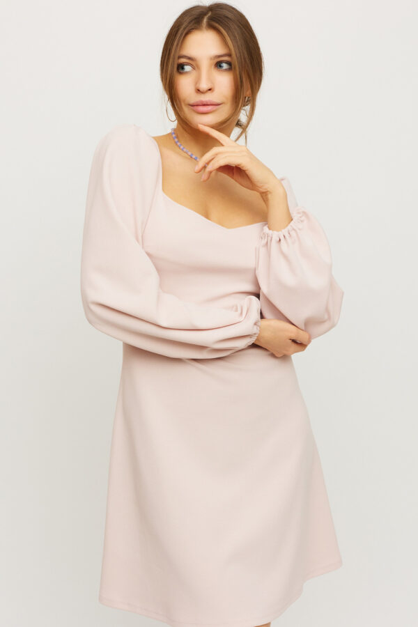 Платье мини из тянущейся фактурной ткани. Глубокое фигурное декольте, отрезная линия талии, юбка полусолнце, рукав широкий со сборкой по плечу