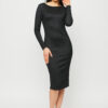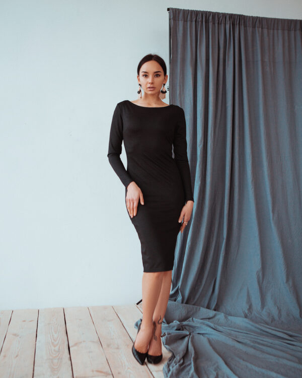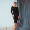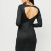 Силуэтное платья из эластичного трикотажа с блеском, на спине вырез, рукав длинный; застежка: пуговица и потайная молния