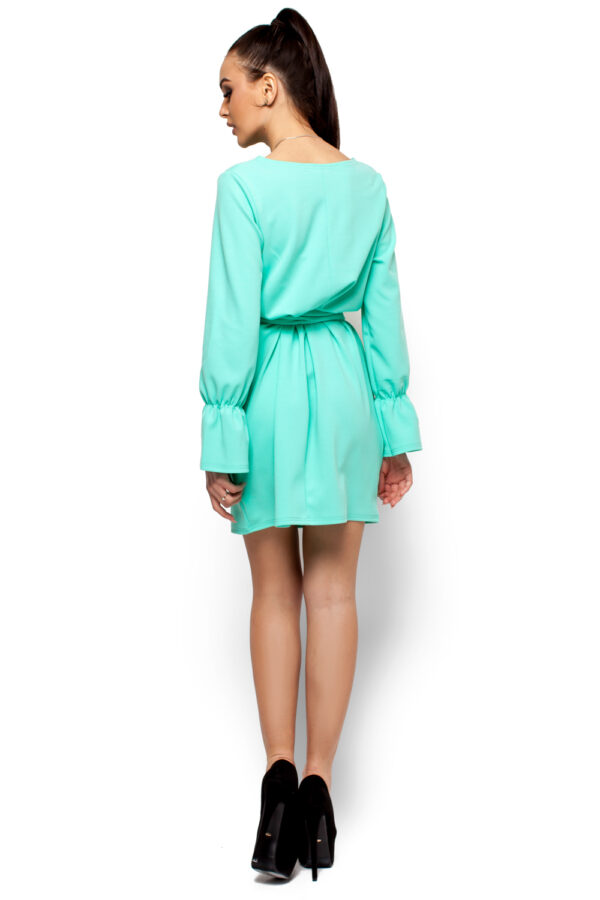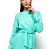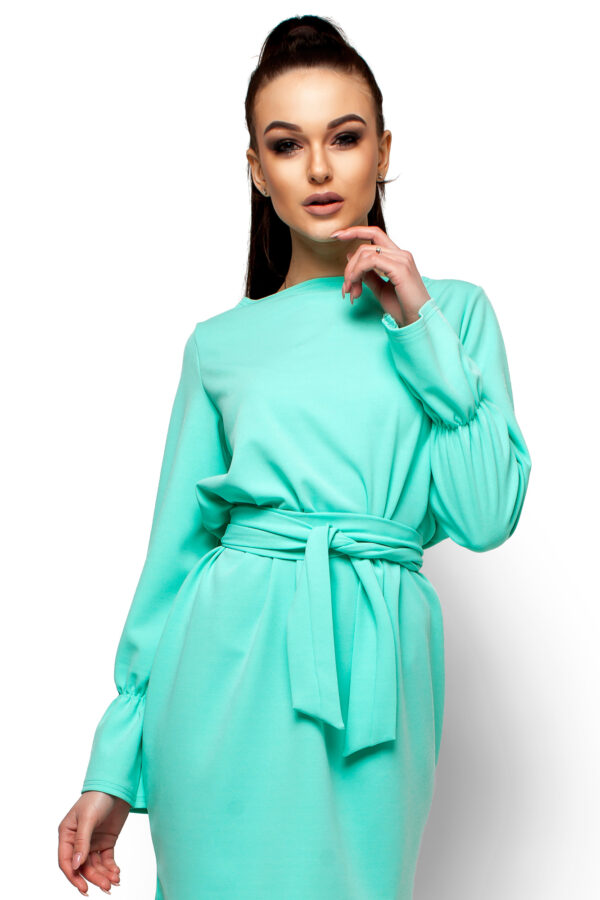 Платье из фактурного эластичного трикотажа кроя “бочонок” с поясом, рукава длинные, чуть ниже локтя собраны резинкой создавая эффект “колокольчика”